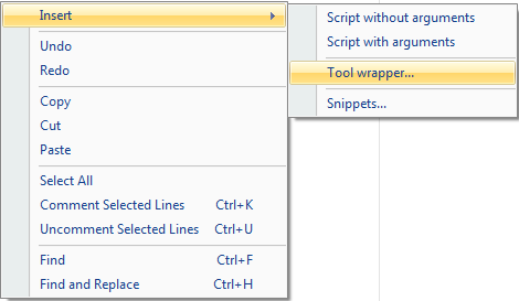 - Another option is to use the tool wrapper functionality from the script editor context menu. Figure 13 demonstrates the context menu of the editor.