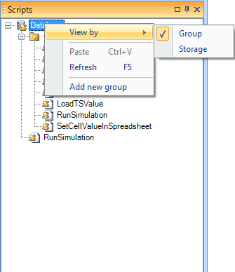 Scripts in the Script Manager can be arranged in groups or by storage and are shown in the user interface as folders. The user is able view these two explorer structures by selecting “View by Group” or “View by Storage” in the Script Manager explorer as depicted in Figure 1.