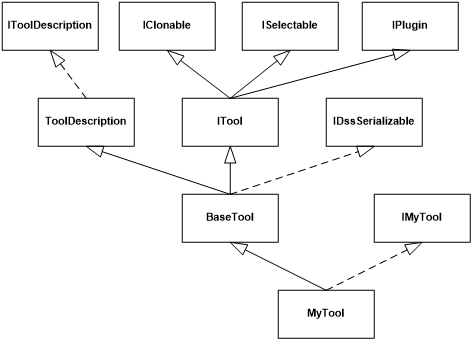 The BaseTool class provides implementation of all required interfaces – except the interface directly related to the functionality of the specific tool (IMyTool).